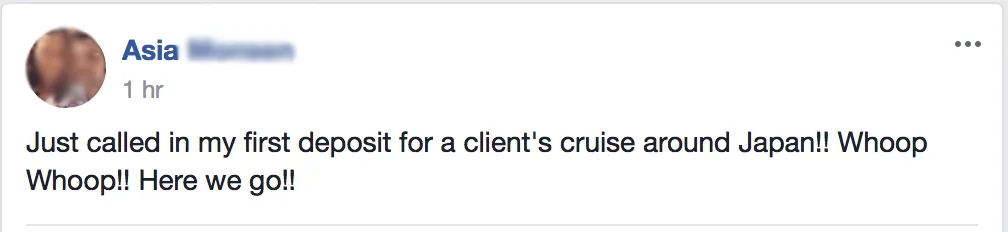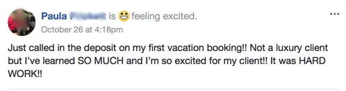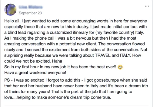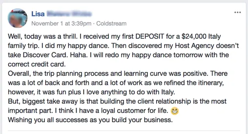 In as little as two months from joining, you'll be booking your first trips. These first bookings are always a little nerve-wracking, so we’re right there with you. You may have basic questions about the procedure or what suppliers to use, or more complex questions about how your potential clients reacted. We've got your back! :)